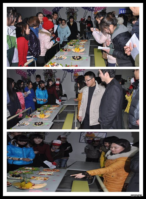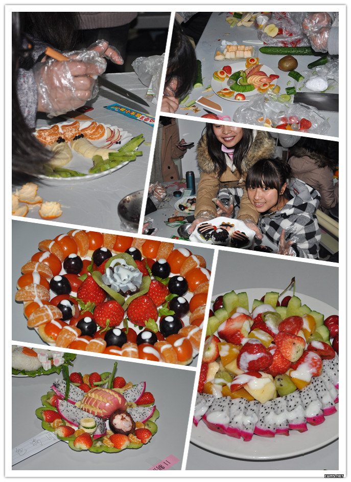 活动分为特色饭团、水果拼盘大赛和美食一条街两部分。首先进行的是特色饭团、水果拼盘大赛,参赛队伍由各个系部推选,共20支队伍。主持人刚说开始,她们就拿着准备好的食材开始展现非凡的厨艺,一道道美食,创意十足,都做了精心准备。有的拼成了可爱的娃娃,有的做成了美丽的小鸟、还有的摆成喜气洋洋的笑脸………做好后,选手们端着各自的作品向评委展示,并解说特色,所有作品都得到了评委们的一致好评。另一边,由同学们及营养食堂的大厨们制作的各种小吃,进行了点心展示与品尝活动。琳琅满目的点心,更像是一场视觉的盛宴,让你垂涎欲滴,深受同学们的欢迎。经过评比,最后检验药学系2011营养2 班制作的特色饭团、2011药管2班制作的水果拼盘分别获得了第一名。