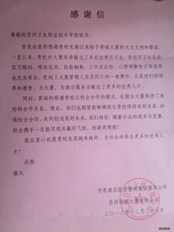 胥城大厦有限公司与我院酒店管理专业有着长期对口就业合作关系,为酒店的发展不断注入新鲜血液,使集团在员工建设上有了明显提高,目前我院酒管专业2009届毕业生黄志慧同学担任集团驻徐州书香世家酒店前厅部经理。