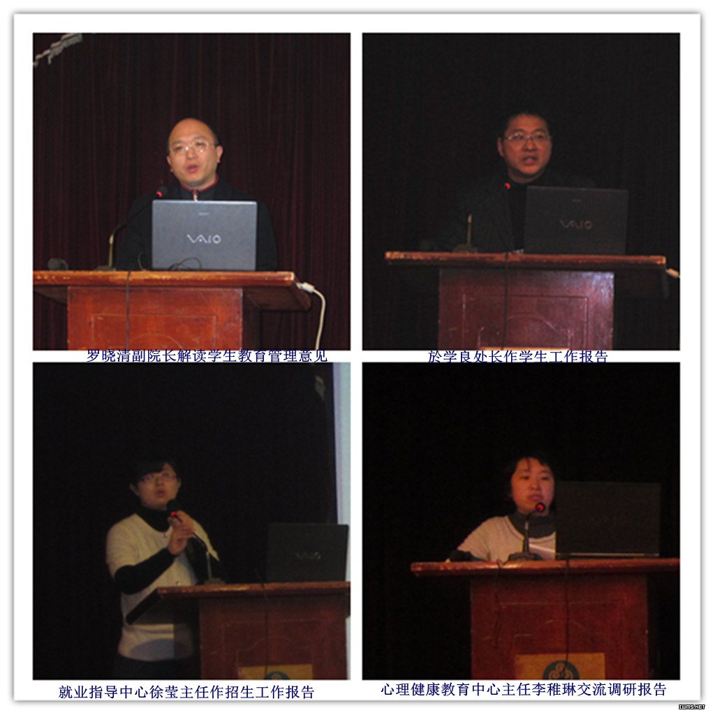 当天上午进行了学生工作汇报。就业指导中心主任徐莹作了招生工作报告,对2012年我院招生情况进行了分析并提出具体的建议,并强调当前招生工作面临更加严峻的考验。学工处处长於学良作了学生工作报告,对学院近三年的学生管理工作进行了总结,分析了工作中存在的不足,并对2013年的学生工作进行了展望。随后,副院长罗晓清肯定了近几年学生工作取得的成绩,也指出了目前学生管理工作存在的困惑和不足,对《进一步加强和改进学生工作的若干意见(讨论稿)》进行解读。提出在新形势下要进一步做好大学生的教育管理工作,要深入贯彻党的“十八大”和学院第一届党代会精神,提高大学生思想政治素质,促进大学生的全面发展。