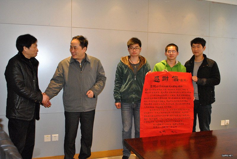 从左至右依次为老人家属蒋先生、学院党委书记崔伟、见义勇为男生冯建旭、周必庆、竺英才