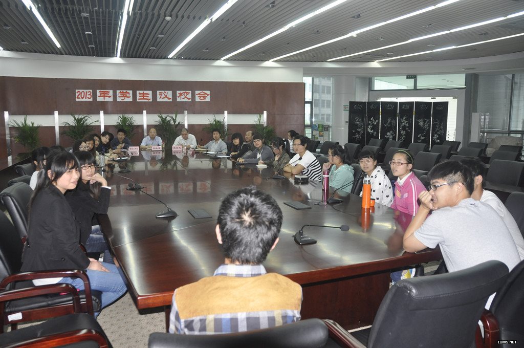 (邵立 摄)周四下午在行政南楼223会议室学院召开了学生议校座谈会,学院副院长罗晓清以及教务处、学工处、后管处、信息中心、体育部、团委等相关处室负责人,石湖校区2012级学生代表参加了会议。
