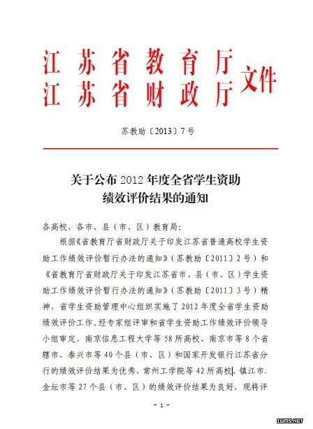 江苏省教育厅、江苏省财政厅近日联合下发《关于公布2012年度全省学生资助绩效评价结果的通知》,我院继2011年荣获江苏省学生资助工作先进单位称号之后,2012年度学生资助工作再获肯定,再度被评为“2012年度江苏省学生资助工作优秀单位”。
