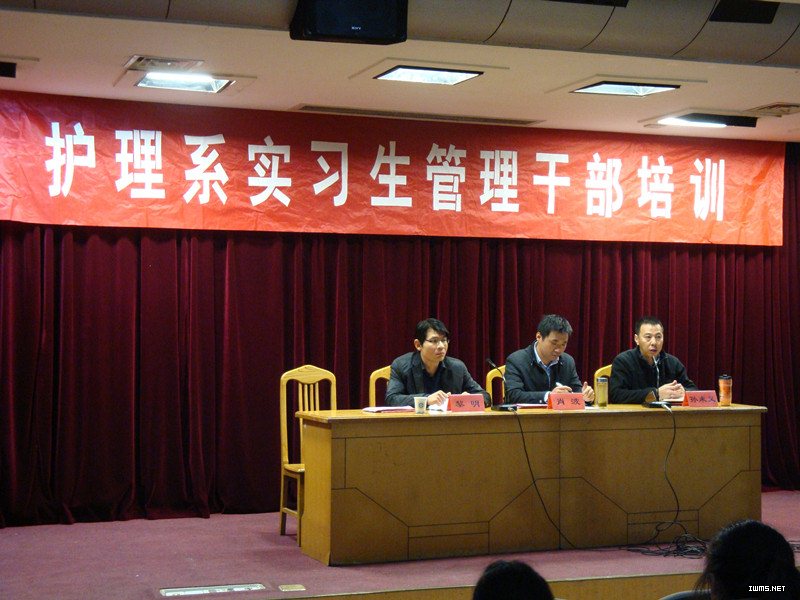 (孙来义 摄)2011级护理专业实习生将于4月26日奔赴各实习点,进入为期一年的临床实习阶段,为了进一步规范和加强实习管理,保证实习教学安全有序进行,提高实习生自我管理意识,护理专业实习生管理干部培训班于2013年3月24日上午,在书院校区第一报告厅开幕,省内外六十家实习单位实习组长、党小组长及团支书共计171人参加本次培训班。学生工作处副处长黎明、护理系总支副书记肖波以及护理系综合办公室主任孙来义出席开班仪式,会议由孙来义主持。