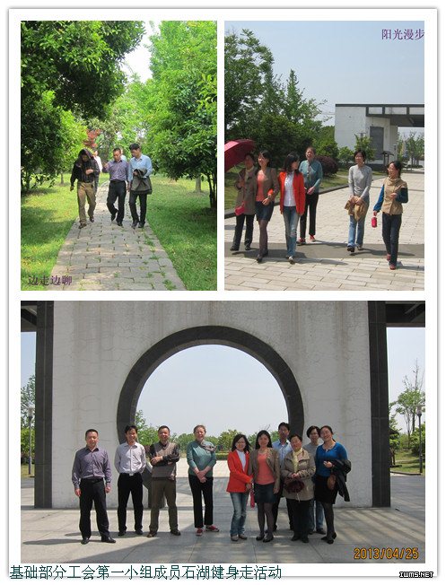 (魏蓉婷 摄)为积极响应学院工会号召,4月25日下午基础部分工会一组组织工会成员开展石湖健身走活动,从学院步行至石湖渔庄,锻炼身体,增强体质。 四月的渔庄绿树成荫,红的、黄的、白的野花盎然成趣。大家在园内鹅卵石铺就的小径上散步、聊天,走累了在湖边的石凳上歇息欣赏周边美景。在不知不觉中锻炼了身体,放松了心情,同时也增进了感情。 老师们长期站在三尺讲台之上,容易发生腿胀、静脉曲张等疾病,而散步既促进血液循环也使工作累的神经细胞得到充分休息。