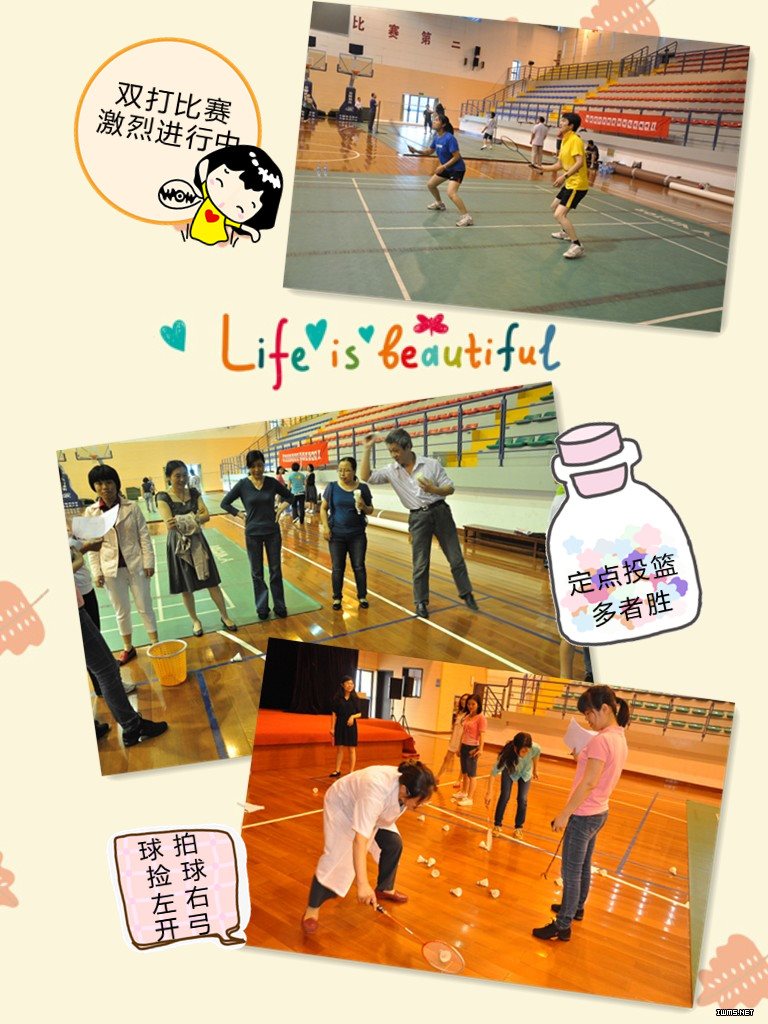 比赛当天,检药系的老师们,不论男女老少,个个精神抖擞、兴致高昂,一改教学上的严谨与不苟言笑,奔跑、穿梭于各个比赛场地,欢声笑语在体育馆上空回荡。趣味赛主要包括五项:1、羽毛球(双打)比赛,由运动员抽签进行自由组合,要的就是意外和惊喜;2、定点入球,每位选手把羽毛球进行“定点投桶”,多为胜;3、颠球跑,三人一组,在规定距离内用拍子颠球向前跑,以时间最短为胜;4、球拍捡球,1分钟内捡球多者取胜。5、假手羽毛球赛,右手换左手,左手换右手,较的就是这个“劲”。比赛过程中,每个项目组织有序,准备充分,气氛热烈,大家抛掉平时繁重的工作压力,在轻松和欢笑中积极参赛,并且在比赛中取得的自己满意的成绩。
