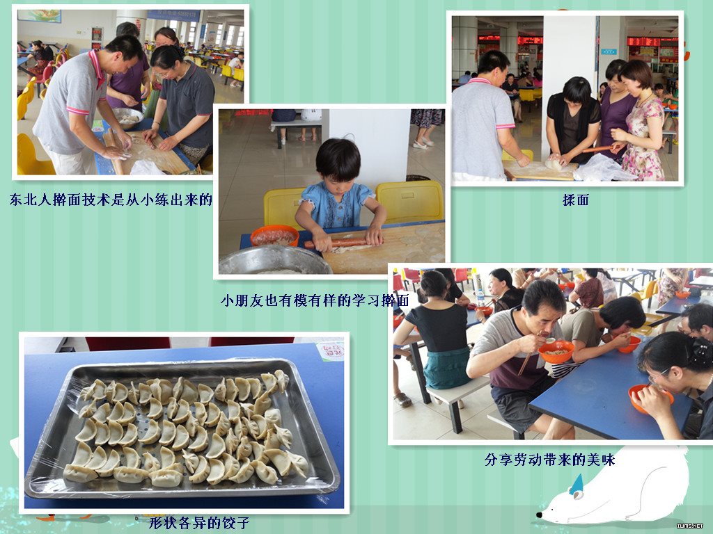 平时在讲台上个个都是教书育人的能手,包起饺子来个个也是不甘示弱,和面、擀面皮、拌馅、包饺子,各尽其职、分工合作,虽说包出来的饺子形状各异,个个乐在其中。