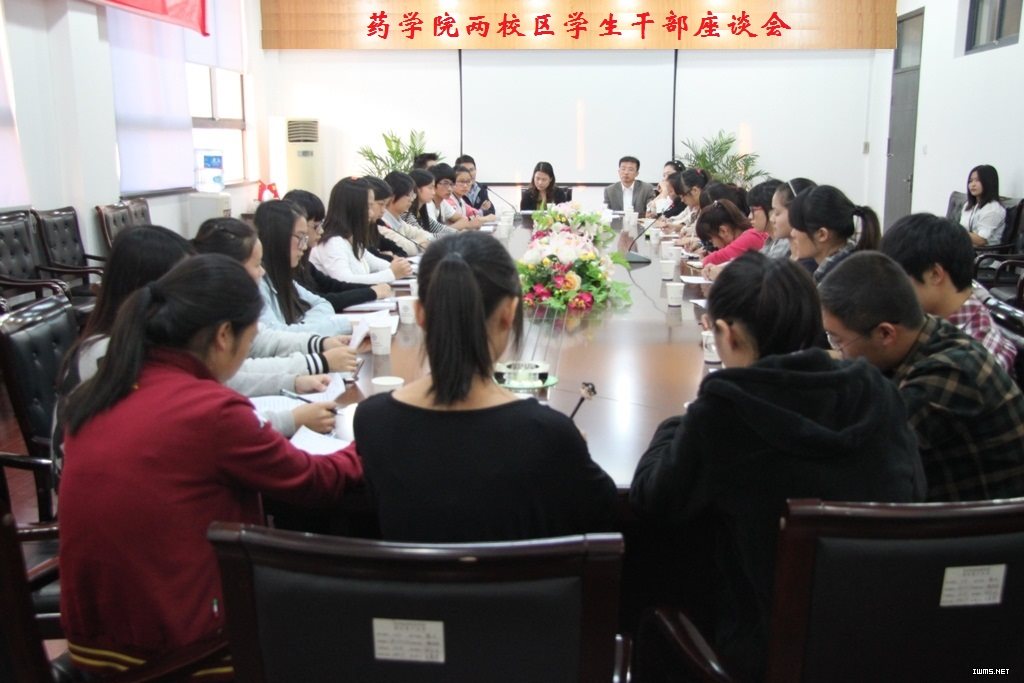 (高沁楠 摄)2013年10月15日,药学院中专、大专的学生干部座谈会在学府校区行政楼大会议室顺利召开。会议由药学院学生会指导老师孙一凡老师主持,药学院院长王德华,党总支副书记邵敏,学工办主任梁卫庆、副主任赵菁菁出席会议。