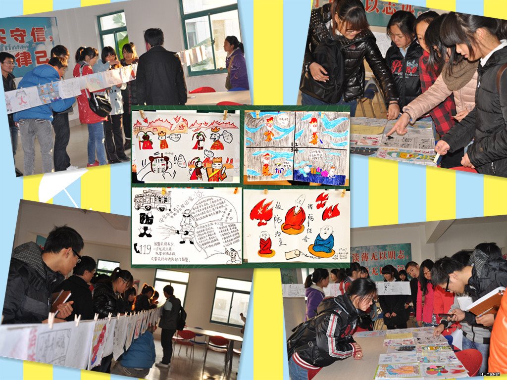 在为期一个月的消防月主题活动时间里,药学院各班级对本班教室、包干区域及所有宿舍的卫生进行了集中检查整治。教室方面,各班集中清理了黑板两侧通知张贴混乱的情况,在黑板报旁边单独开辟出公告栏。对于讲台进行了清扫和布置,有些班级还废品利用自制了粉笔篮并写上对老师的祝福。宿舍方面,针对2012级药学专业混合宿舍管理方面的难题,药学院学生会生活部统一制作表格,请全体宿舍填写值日名单并统一张贴到指定位置,通过探索混合宿舍卫生责任的“首问负责制”以强化常规管理。在当天的教室参观、男女生宿舍互访活动结束后,观察团的同学们还参加了消防漫画展活动。结合11月消防月主题,药学院以宿舍为单位,征集了62副原创消防主题漫画,在1、2号宿舍楼的公共活动室集中展出。同学们饶有兴趣地进行了参观,并给自己支持的作品投上了一票。