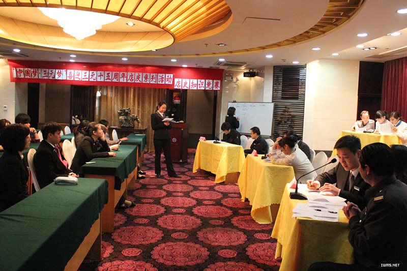(应亮 摄)12月2日下午点,宾馆在多功能厅举办了“中国梦•三元梦”十五周年店庆系列活动——店史知识竞赛。宾馆在十五周年大事记制作印刷成册后,立即发给每个部门,各部门认真组织学习、培训,积极准备,踊跃参与。此次竞赛共分五个代表队,每队三名选手参加,每位选手回答十道题,根据每组的最后总得分决出胜负。五支代表队经过激烈的角逐,餐饮代表队荣获第一名。通过此次知识竞赛,使宾馆员工及管理人员对宾馆十五年来重大事件、发展历程、经营活动等有了更深层次的了解,增强了员工的集体荣誉感和凝聚力,作为此次十五周年店庆系列活动的最后一项,圆满地拉上了活动的帷幕。