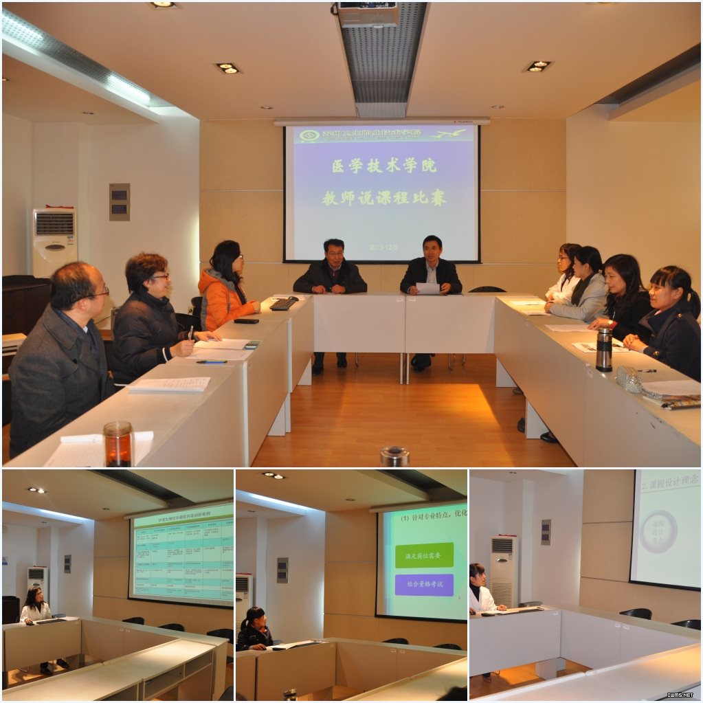 2013年12月5日医学技术学院在石湖校区实验北楼五楼会议室举办了教师说课程比赛,邀请医学技术学院副院长肖波、唐建中,检验教研室主任褚静英、黄静芳,病理教研室主任郭云娣,康复教研室主任林清,营养教研室赵云芳副教授作为本次说课程比赛的评委。
