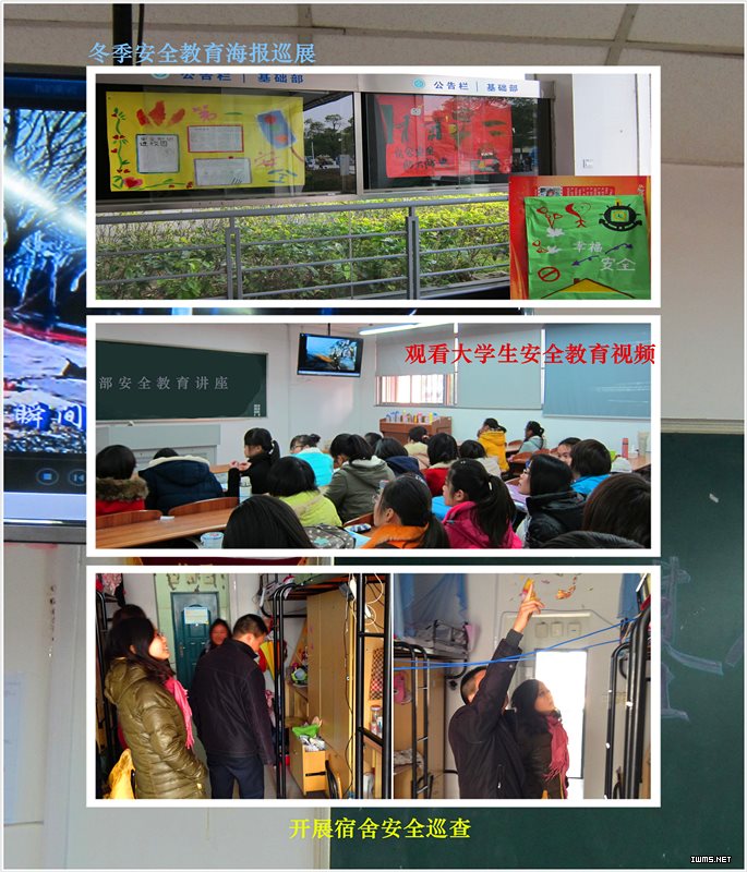 安全问题无小事,安全教育要从身边入手,自12月初,基础部就在全系学生中组织了安全教育周活动,以海报、宣传画的形式围绕冬季安全进行了巡展,同时结合支部小报、主题班会,向同学们宣讲安全知识,此次讲座则集中展示了大学日常生活中可能存在的安全隐患,对安全防护与自救知识进行了宣传。