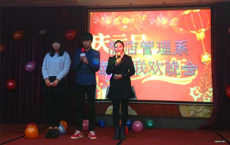 (李力群 摄)2014年1月2日,酒店管理系2012、2013级学生在三元宾馆多功能厅举行庆元旦、迎新年联欢晚会,晚会在18点18分准时开始。三元宾馆副总经理俞险峰、卞瑾副以及酒管系李力群、焦玲玲和朱青青老师参加了联欢晚会。